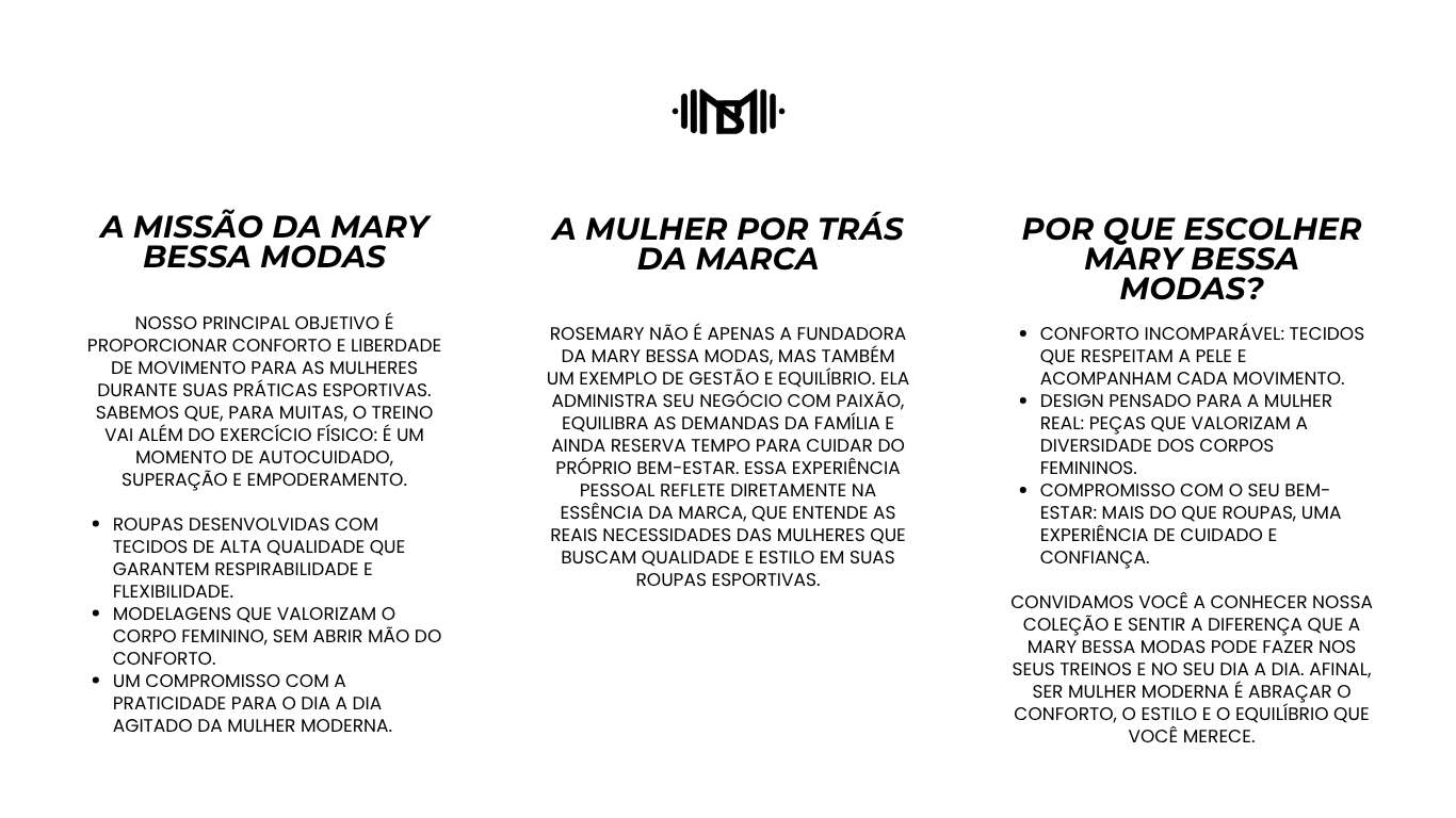 Mary Bessa Modas nasceu da visão inspiradora de Rosemary, uma mulher moderna que entendeu a necessidade de unir conforto e estilo na hora dos treinos. Como uma empreendedora dedicada, Rosemary criou uma marca que valoriza o bem-estar feminino, oferecendo roupas que acompanham o ritmo da mulher atual.